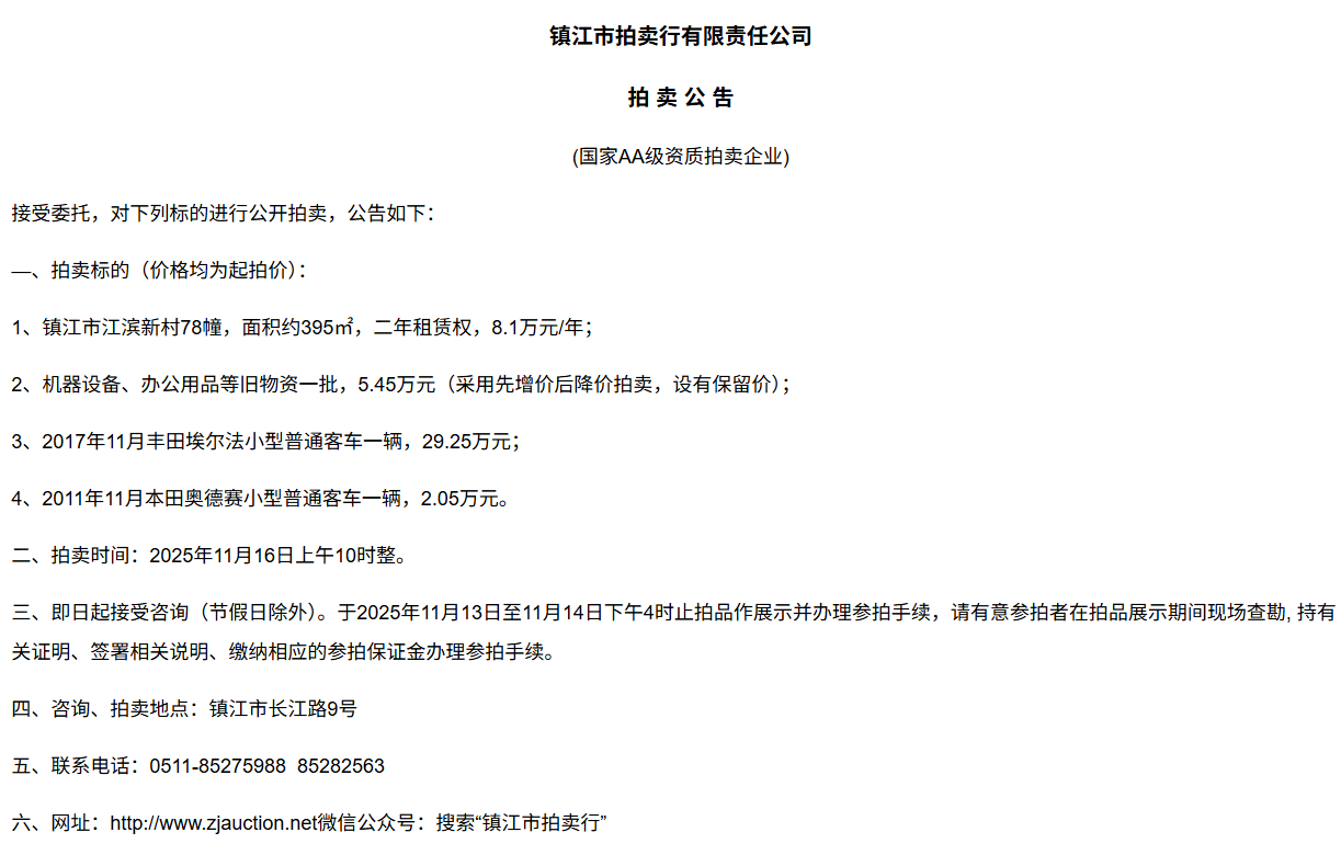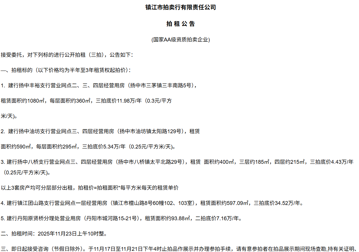 鎮江市拍賣行有限責任公司拍 租 公 吿(國家AA級資質拍賣企業)接受委托,對下列標的進行公開拍租(三拍),公告如下:—、拍租標的(以下價格均為半年至3年租賃權起拍價):1.  建行揚中豐裕支行營業網點二、三、四層經營用房(揚中市三茅鎮三豐南路5號),租賃面積約1080㎡,每層面積約360㎡,三拍底價11.98萬/年(0.3元/平方米/天)。2.  建行揚中油坊支行營業網點三、四層經營用房(揚中市油坊鎮太陽路129號),租賃面積約590㎡,每層面積約295㎡,三拍底價5.34萬/年(0.25元/平方米/天)。3. 建行揚中八橋支行營業網點三、四層經營用房(揚中市八橋鎮太平北路29號),租賃  面積約400㎡,三層約185㎡,四層約215㎡,三拍底價4.43萬/年(0.25元/平方米/天)。以上3套房產均可分層部分出租,拍租價=拍租面積*每平方米每天的租賃單價4. 建行鎮江團山路支行營業網點一層經營用房(鎮江市檀山路8號60幢102、103室),租賃面積約597.09㎡,三拍底價34.52萬/年。5. 建行丹陽原賢橋分理處營業用房(丹陽市城河路15-21號),租賃面積約93.88㎡,二拍底價7.16萬/年。二、拍租時間:2025年11月23日上午10時整。三、即日起接受咨詢(節假日除外)。于11月17日至11月21日下午4時止拍品作展示并辦理參拍手續,請有意參拍者在拍品展示期間現場查勘,持有關證明、簽署相關說明、繳納相應的參拍保證金辦理參拍手續。四、咨詢、拍租地點:鎮江市長江路9號五、聯系方式:0511-85275988   13655299933楊先生六、網址:http://www_zjauction_net.stevennarleski.com;微信公眾號:搜索“鎮江市拍賣行” 拍品清單2025.11.23序號名稱起拍價(元)標的說明1建行揚中豐裕支行營業網點二、三、四層經營用房(揚中市三茅鎮三豐南路5號),租賃面積約1080㎡,每層面積約360㎡三拍底價11.98萬/年(0.3元/平方米/天)1、1-3號房產均可分層部分出租,拍租價=拍租面積*每平方米每天的租賃單價;2、意向競拍人在拍賣前需持營業執照或身份證與委托方說明租賃房產經營業態,確定意向后出具房產承租用途承諾書,經委托方審核后,方可交納保證金參加競拍;3、租賃期限為半年至3年(承租方與出租方協商而定),承租方每半年或一年結付租金,租賃期間的水、電費用及其它相關費用均由承租方承擔;4、承租方不得用于經營和保管危險物品,不得用于開設餐飲、娛樂等可能嚴重影響消防安全、運營安全的經營業態,不得用于經營委托貸款、小額貸款等可能冒用委托方名義,帶來聲譽風險的經營業態。租賃期內,承租方不得破壞墻體結構,自行成就消防、安全等使用條件,不得擅自將租賃房屋轉租、轉讓給他人使用,否則委托方有權收回房屋;5、拍租成交后,承租方將租金交至出租方指定賬戶,傭金交至拍賣方賬戶(拍租傭金為該房屋一個月租金)。承租方憑租賃合同無息退還保證金。2建行揚中油坊支行營業網點三、四層經營用房(揚中市油坊鎮太陽路129號),租賃面積約590㎡,每層面積約295㎡三拍底價5.34萬/年(0.25元/平方米/天)3建行揚中八橋支行營業網點三、四層經營用房(揚中市八橋鎮太平北路29號),租賃面積約490㎡,每層面積約245㎡三拍底價4.43萬/年(0.25元/平方米/天)4建行鎮江團山路支行營業網點一層經營用房(鎮江市檀山路8號60幢102、103室),建筑面積約597.09㎡三拍底價34.52萬/年5建行丹陽原賢橋分理處營業用房(丹陽市城河路15-21號),建筑面積約93.88㎡二拍底價7.16萬/年